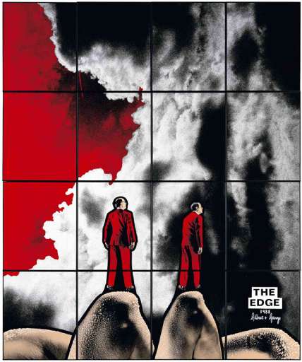 Senza dubbio egocentrici, sono soliti rappresentarsi nelle loro opere, talvolta nella consueta “divisa”, in altre occasioni nudi o in slip, sprezzanti dell’età che avanza impietosa. Da questi tranquilli inglesi ci si aspetterebbe una buona tazza di thè; invece offrono opere gigantesche dai colori accesi e dai contenuti urlati, dissacranti e provocatori. Non sono gli autori di un trattato sulle farfalle, ma firmano opere intitolate Fuck, Lick, Cunt o Sperm Eaters. Da quarant’anni, questa premiata ditta si diverte a scandalizzare i benpensanti, creando un cortocircuito d’immagine tra la propria figura e la propria opera, parlando di sesso, religione e morte. Vivono in una casa nell’East End londinese. Da lì osservano il mondo e trovano l’ispirazione necessaria per la loro arte. Perché “non accade nulla nel mondo che non accada nell’East End”.