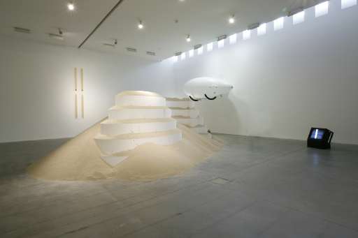 Le celebrazioni-riflessioni hanno inizio con una triplice personale, stranamente non firmata da alcun curatore, in cui vengono esposte alcune tappe ideali di un Ambient tour che s’inaugura sulla grande duna di sabbia, simbolo della progressiva desertificazione dell’area mediterranea, sorvolata da un mini-dirigibile telecomandato che Christian Frosi (Milano 1973) pone tra grandi virgolette di legno appese alle pareti. In una commistione di stili e linguaggi che vanno dal concettuale al minimalismo passando per un video ispirato al Manifesto Spazialista, concepito come programma sperimentale per la televisione e trasmesso dalla Rai di Milano il 17 Maggio 1952.