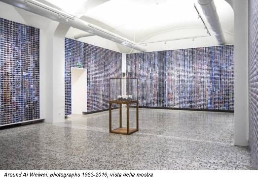 È, tuttavia, dall’esperienza americana che si coglie già una metodologia che sottende un uso intensivo, quasi esasperante e voyeuristico del media fotografico. Di 10.000 negativi realizzati dall’artista, una selezione di circa ottanta scatti in bianco e nero introduce la mostra cogliendo i momenti salienti della formazione artistica di un giovane Ai Weiwei nel decennio newyorkese. La serie New York Photographs 1983-1993 è, infatti, scandita dagli incontri con artisti e poeti come Allen Ginsberg, da spaccati di vita privata a immagini che restituiscono l’atmosfera culturale respirata da Ai Weiwei e dichiarano già apertamente l’interesse per il linguaggio di Duchamp e Warhol; suggestioni che si palesano in alcune fotografie e sculture esposte in mostra- come l’opera di impronta dadaista One Man Shoe (1987)- con le quali rende omaggio ai due maestri. Dagli interni del suo appartamento si passa alle strade della città, a scorci che fungono da sfondo e, al tempo stesso, assurgono a simboli evocativi dell’atmosfera socio-politica di quegli anni, come nel reportage di denuncia della repressione e delle violenze perpetrate dalle forze dell’ordine durante gli scontri di Tompkins Square Park. La libertà di espressione, il rispetto della dignità dell’uomo, il diritto e la ricerca della verità assurgono a valori universali consegnati alla forza d’espressione e alla capacità della fotografia e del video di documentare gli eventi. Le immagini del periodo newyorkese scorrono lungo la parete, accompagnate dall’installazione Soft Ground (2014); un tappeto che riproduce in scala 1:1 tracce dei carri armati, segni che evocano la drammatica repressione messa in atto in piazza Tienanmen un anno dopo i fatti newyorkesi. La Cina, contestata e amata, è sempre presente nelle riflessioni dell’artista. Agli anni americani seguono quelli del ritorno in patria, introdotti dalla video-intervista realizzata da Daria Menozzi, Before Ai Weiwei (1995)- una breccia nella vita e nell’attività di un giovane artista che rivela l’orientamento della sua poetica- mentre con la serie di fotografie Beijing Photographs 1993-2003 l’attenzione si sposta sugli affetti famigliari, in particolare sulla figura importante del padre, il poeta Ai Qing, simbolo della resistenza contro l’oppressione del governo cinese, di cui non si limita a restituirne un ritratto fotografico, ma ne documenta il ricovero in ospedale e gli ultimi giorni di vita. Immagini dell’entourage e dell’ambiente culturale cinese frequentato da Ai Weiwei, dell’incontro con Harald Szeemann si stagliano sullo sfondo di una Cina in continuo e rapido cambiamento, tra tradizione e globalizzazione, i cui effetti e il cui impatto sono restituiti dai video Chang’on Boulevard (2004) e Beijing: The Second Ring (2005); opere di denuncia nelle quali le strade di Pechino diventano oggetto di un lungo lavoro di osservazione in cui la dinamica del tempo restituisce il senso e l’insensatezza di violente trasformazioni incuranti delle implicazioni socio-culturali. Immagini eloquenti che, come frammenti di punti di vista differenti, si compongono per restituire il senso di una presa di posizione quotidiana della quale ogni fotografia è testimone e segno della partecipazione dell’artista. Nella difesa dei diritti umani e nella denuncia dei crimini e della repressione da parte del potere, l’artista inscrive la sua personale esperienza dove vita e arte si mescolano inevitabilmente. E il culmine del linguaggio di Ai Weiwei è raggiunto con Refugee Wallpaper (2016), in cui 17.000 immagini realizzate con smartphone raccontano il dramma della migrazione e ricoprono le pareti della sala travolgendo il visitatore in una sensazione di sovraesposizione che induce a riflettere sull’impatto delle tecnologie.