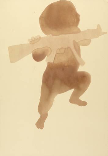 Di rara leggerezza anche i lavori proposti su carta abrasiva nera. Qui niente sembra rimanere escluso da una scena che contempli armi, carri armati, fucili e bombe a mano. I neonati, appiattiti sulla carta e manipolati in modo da sembrare delicati acquerelli, rimangono lì, seguendo l’effetto desiderato. L’effetto della sospensione, di quella domanda che non trova risposta. Ma neanche senso. Quella domanda che esce davanti a queste riproduzioni, senza ottenere un seguito. Ma perché? E fra le tracce di cera malleata il canto, sommesso e spento dalla noia interiore, scopre un registro più alto che diventa solenne. Attraverso di esso, le grandi delusioni, le stanchezze, le fragilità di un momento avanzano una proposta forse paradossale, ma che pare accettabile davanti ai lavori di Piccari: modificare la vita fino al punto di annullarla, sostituendo un’ideale di visione con la squallida estetica del quotidiano.