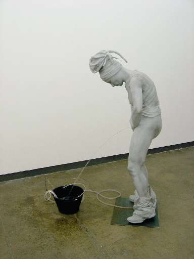 Ad accogliere il visitatore, un corpo rivolto di spalle, una scultura ad altezza naturale, che, in piedi e con i pantaloni abbassati, fa pipì in un secchio posto di fronte. La scultura è prodotta dal calco del corpo della stessa artista, colta in un atto intimo e personale, ma, soprattutto, maschile. Il materiale utilizzato –gesso di tipo industriale, lasciato grezzo- e la volontà di mantenere a vista il congegno che permette il ricircolo dell’acqua dal secchio al corpo, connotano di fredda razionalità l’intero progetto.