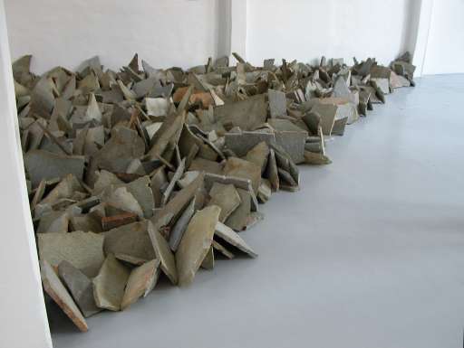 Partendo dal basso, s’incontra dapprima la monumentale Piemonte Line (2006), oltre venti metri per quasi cinque ad opera di Richard Long (Bristol, 1945). L’intera parete lunga della sala, dal soffitto al pavimento, è stata dipinta di nero, e su di essa ha lavorato Long, disegnando uno skyline geometrico ricoperto di fango, che schizza e sprizza dalla linea del titolo per rimbalzare sul resto della parte e posarsi a terra, con guizzi gestuali che speriamo di poter vedere documentati. Sul lato opposto, l’artista ha accatastato con metodicità un numero notevole di pietre di Luserna (Piemonte stones, 2006). Pietre locali, dunque, che richiamano le Su Xu Xu stones (2005) del fototesto che le accompagna, insieme a Walking flowing (2005), che accosta ancora parola scritta e fotografia, in maniera simile a quanto fa Hamish Fulton, sebbene quest’ultimo si concentri maggiormente sulla pittura murale che “descrive” i suoi percorsi. Non è comunque un caso che entrambi, seppur con motivazioni differenti, tendano a dissociarsi dall’etichetta che li vorrebbe esponenti della Land Art. Altri cinque lavori, tutti datati 2006 e Untitled, sono esibiti fra il pianterreno e le scale che portano al piano superiore. Opere su supporti lignei, che paiono reperti tratti da un museo di arti e mestieri locali, sui quali Long è intervenuto con l’acrilico e l’immancabile fango, reinfondendo loro la carica vitale, grazie a poche macchie regolari e “decorazioni” applicate coi polpastrelli.