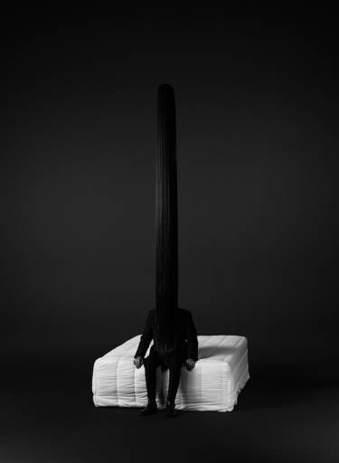 Su un letto bianco è seduto un individuo (l’artista stesso), vestito di nero;
