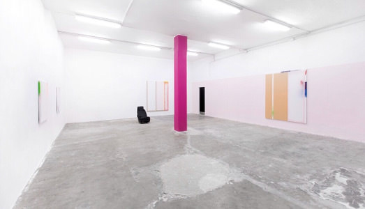 Geometrie piane e solide creano una sottile rete di rimandi non solo formali ma anche cromatici, a partire dal pilastro quadrangolare che, come una scultura a tutto tondo, si staglia perentoria al centro dello spazio e il cui colore-magenta- spiccando dal bianco dominante dell’ambiente, sembra riverberarsi nel rosa tenue di una delle pareti perimetrali. Il muro diviene tela, e su di esso si sovrappone il quadro che riporta i segni autografi dell’artista rivelatori del suo background formativo. Campiture piatte e modulari in acrilico, a loro volta sovrapposte e giustapposte, trova campo d’azione la gestualità dell’artista mediante il ricorso a diverse tecniche pittoriche, come pastelli e matite. Una complessità progettuale che si esprime mediante una stratificazione reiterata che determina un rapporto di continuità/coincidenza /sovrapposizione degli elementi che sembrano causare uno sconfinamento quasi identitario tra pittura, scultura e architettura, condizionando i livelli di percezione e lettura delle opere.