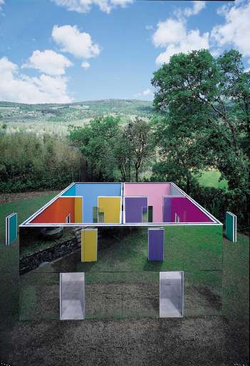 La Cabane éclatée aux 4 Salles adotta un linguaggio assolutamente contemporaneo, eppure si pone in linea con elementi tipici del parco di scultura storico. Come il castello dal pavimento inclinato di Bomarzo oppure come i labirinti di verzura, la cabina sradica ogni certezza percettiva e fa perdere al visitatore la possibilità di orientarsi nello spazio. Apparenza e realtà non hanno confini. Sin dall’inizio, sin dal momento in cui, percorrendo la strada sterrata che si snoda nel parco all’inglese intorno alla Fattoria di Celle, si intravede l’opera di Buren. Che si camuffa sotto un cappuccio di riflessi. L’artista sfrutta e valorizza una delle caratteristiche più evidenti del giardino, progettato da Giovanni Gambini nel 1844-45: l’ambiente apparentemente naturale regala aperture tra la vegetazione, che svelano panorami classici, alla Claude Lorrain. E proprio in uno di essi si inserisce la cabina. Come una sorpresa dall’involucro discreto e dall’interno esplosivo.