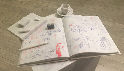 Nel plinto marmoreo che riproduce il suo notes degli appunti posto sul tavolo lavoro con a fianco una tazzina da caffè l’aderenza alla realtà è evidente e l’attenzione al dettaglio, quasi esasperata, traduce in forme plastiche uno spaccato del suo quotidiano.