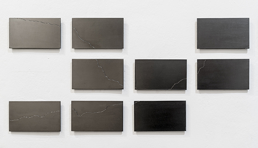 A portare alla luce questa dimensione, in mostra, sono opere dall’essenza minimalista e fortemente strutturate, con una ridottissima gamma cromatica che unite al lavoro delicato e essenziale di Cerviño segnano il punto di convergenza tra il Creato, la vulnerabilità umana e il fare artistico. Nell’installazione Altar (2018) 108 lastre rettangolari in alabastro, sottilissime, sono poggiate a terra una davanti all’altra in orizzontale o in verticale all’interno di una nicchia dello spazio espositivo. Dei lumini accesi frapposti tra le lastre esaltano il loro essere translucide e rendono visibile l’impalpabile tratto inciso che percorre tutte le laste e traccia il profilo di una montagna. Lo stesso tratto vibrante solca l’opera sulla parete opposta, Oración (2018), dove 59 tavolette in grafite – tante quanti i grani del Rosario cattolico – portano anch’esse impresso il profilo di una montagna, luogo per antonomasia di incontro tra umano e divino. La Terra, sotto forma di ossido di ferro torna sulla grande tela di lino grezzo del quadro Testimonio de la Brisa 6 (2018), che fiorisce dal profondo legame di Cerviño con l’elemento naturale puro, come il video, Duelo (2013), che registra il movimento di un’onda sulla battigia o nell’installazione sonora Estanque (2018), in cui nel pavimento della galleria è stato praticato un foro riempito d’acqua, unico punto illuminato nella sala vuota, in cui di tanto in tanto si ode il suono di una goccia che cade. Esempio delicato e poetico dell’uso di un materiale nella sua essenzialità è Mallas (Nets) (2017), in cui l’artista sfrutta la trama e l’ordito delle zanzariere metalliche per creare pieni e vuoti in base a precise proporzioni geometriche. “La mostra – spiega l’artista – è un supporto per la memoria, vestigia che filtrano le fragilità umane, gesti che ciclicamente ci accarezzano e in molte occasioni non vediamo, non sentiamo che siamo parte di quella, un’immensa unità.”