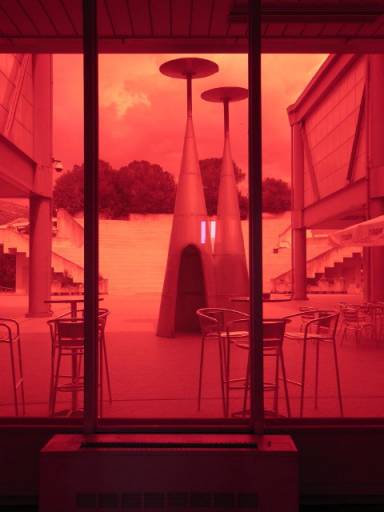 L’effetto di irrealtà aumenta se si guarda fuori: i colori sono distorti, l’immagine dell’esterno è come immobilizzata in campi di colori acidi, violenti. E, ancora una volta, Parisi propone un dialogo con le opere presenti nel museo. Stavolta si tratta di Fountain on youth di Albert Hien, dislocata nello spazio antistante le vetrate, che viene così inglobata nella visione, fino ad assumere l’aspetto di una stazione lunare. E così, ecco un altro altrove, un’altra geografia.