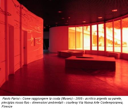 Si ha l’impressione di essere in un osservatorio anche penetrando nell’altro ambiente in cui Parisi è intervenuto, coprendo le vetrate con lastre rosse fluorescenti e tracciando sulla parete di fronte alle stesse vetrate segni ideati a partire da mappe e tracciati cartografici. Lo spazio ne risulta profondamente modificato, immerso in un liquido amniotico rosso, fatto non di materia ma di luce. Sembra di poterci galleggiare dentro seguendo la geografia snaturata, non più indice razionale di uno spazio ma immagine decodificabile solo per empatia, delle tracce che luccicano sulla parete.