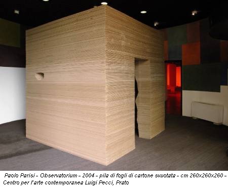È un osservatorio la struttura realizzata con fogli di cartone sovrapposti, a creare un volume geometrico nel quale si schiudono, grazie a buchi praticati negli strati di cellulosa, aperture irregolari dalle forme tonde, quasi organiche. Come se fossero i varchi di un apparato respiratorio. Come un organismo vivente sviluppatosi per stratificazioni successive, da cui si può sì osservare l’esterno (cioè, tra l’altro, l’installazione permanente di Sol LeWitt, rettangoli di colori diversi sulle pareti), ma anche calarsi in un interno avvolgente, onirico, bizzarramente vivente. Come se l’altrove fosse, in questo caso, non tanto ciò che sta fuori, ma le possibilità di un interno vivo benché solitamente nascosto, inaccessibile.