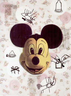 Dallo sfondo di tappezzerie a motivi arborei avanzano corpi di uomini e di animali, oggetti di uso comune (una sedia, un peluche) e meno (un estintore), si arrestano appena prima della soglia del quadro per lasciare il primo piano ad altre figure, creaturine da fiaba o illustrazioni didascaliche sull’uso corretto del preservativo.