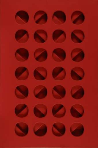 Una carriera brevissima che, seguendo il percorso espositivo, comincia con aggregati materici per arrivare alla cifra stilistica di Scheggi, quelle tele monocrome formate da tre strati sovrapposti, l’ultimo dei quali funge da limite, parzialmente visibile attraverso gli altri due, bucati da aperture sagomate che non corrispondono tra loro, pur ripetendo forme simili. Il primo strato funge da passaggio fra esterno e interno, mentre quello posto nel mezzo complica il rapporto fra gli altri due, creando un livello intermedio che rifrange lo sguardo, lo devia, crea zone variabili e non nette di luce e ombra. A partire dal 1966, le opere presentano una composizione più strettamente geometrica: nel livello più esterno si aprono circonferenze identiche, ordinate rigorosamente in file, mentre lo strato intermedio le taglia obliquamente secondo angolazioni scandite in modo altrettanto regolare.