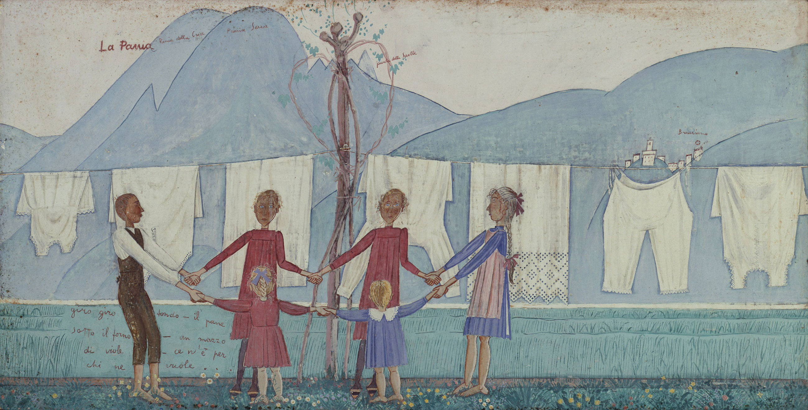 Un altro documento straordinario di questo precoce interesse è un bozzetto realizzato da Giacomo Balla per il quadro Fallimento (1902 circa), esposto insieme a un piccolo disegno preparatorio, a rivelare l’impegno profuso dall’artista nel ricreare i segni infantili tracciati col gesso sulla porta del negozio chiuso. Segue quindi un’ampia sezione dedicata a un pittore poco noto, Alberto Magri, che con gli amici “apuani” Lorenzo Viani e Adolfo Balduini, è stato un precursore nell’adottare stilemi infantili (e medievali), anche sotto la suggestione della poetica del “fanciullino” di Pascoli, altro riferimento essenziale per la cultura italiana. Un’altra ricca sezione illustra l’influenza esercitata da Soffici e Carrà nel diffondere in Italia il gusto per un’arte infantile e popolare, seguendo anche l’esempio del Doganiere Rousseau.