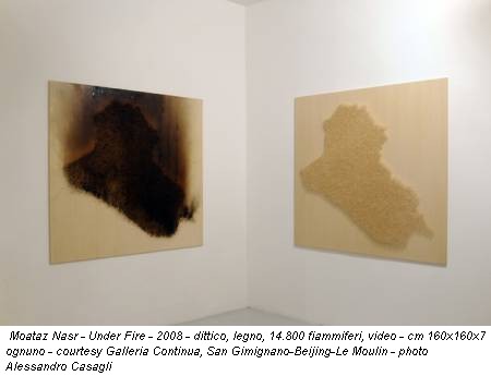 Under Fire: un Iraq fatto di fiammiferi, i cui colori diversi afferiscono alle molte etnie che compongono la sua popolazione. A un pannello identico è stato appiccato il fuoco: il cadavere carbonizzato dellâIraq, arso sotto lâeffetto domino di 14.800 fiammiferi, giace come una condanna. Alle fiamme sono scampati, accidentalmente, due fiammiferi: finchè câè vitaâŚ