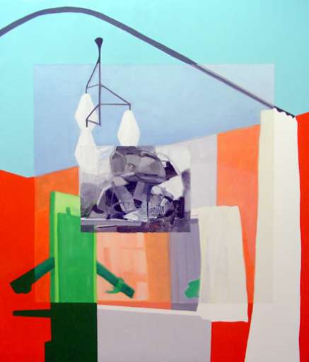 Ci sono, nell’ultima delle tre sale della galleria Spazio A di Pistoia, due tele di Alessandro Roma (Milano, 1977) dallo stesso titolo, Fall out shelter. Ambienti quotidiani scomposti in elementi quadrangolari e ricomposti senza ordine, nella confusione di chi non riconosce più cosa è dentro e cosa è fuori, cosa è reale e cosa non lo è. Nella parte esterna lo smalto, quasi una cornice, luccica come le pagine di una rivista, mentre nella parte centrale un riquadro in bianco e nero, dalla consistenza fortemente materica, contiene macchine sfasciate da incidenti. Forse un’intrusione di immagini provenienti dallo schermo televisivo?