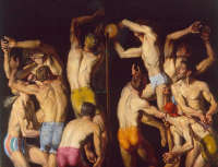 All’interno della Chiesa sono esposti i dipinti, tutti di ampie dimensioni: l’artista ha personalmente curato l’allestimento. In alcune delle venti opere ad olio sono ritratti incontri di pugilato: in gioventù, infatti, Sheppard si avvicinò al mondo della boxe, e strinse amicizia con atleti del calibro di Floyd Patterson e Jack Dempsey. In un altro dipinto alcuni ragazzi sono impegnati in una gara di pallavolo: lo spazio del rettangolo di gioco appare strettissimo e i protagonisti si ammucchiano; l’artista sembra interessato a cogliere l’attimo di massima tensione dei muscoli. Percepiamo la fatica e l’agonismo come espressioni che servono agli uomini per valorizzare, in primo luogo, la bellezza e la perfezione dei loro corpi. Sheppard fa riferimento, in questo senso, alla scultura classica. In un’ulteriore opera osserviamo un altro gruppo di giovani impegnati in un ballo vorticoso in una discoteca: sia in questo quadro, sia in quello precedente, una luce nera circonda i personaggi e ci impedisce di vedere l’ambiente entro cui essi si muovono. Avvertiamo quasi, invece, l’incalzante ritmo della musica e percepiamo la tensione agonistica che aumenta: assorbiti nelle loro ludiche attività e immersi in una notte apparentemente sconfinata, i personaggi dei due dipinti sembrano coinvolti in un rito. In una tela successiva osserviamo uomini e donne su una spiaggia vicino al mare: il sole splende e l’atmosfera è giocosa.