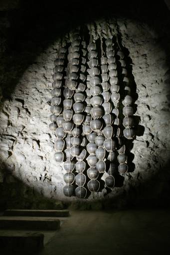 Chiude la mostra, lontano dai riflettori, nel silenzio dello spazio di via castello 17, Bhandarrghar (2007-08), l’intervento ambientale, più sacrale e introspettivo, di un enorme grappolo di giare nere (contenitori d’anime?), sospeso come un alveare con una tessitura di corde e nodi lungo la parete scavata.