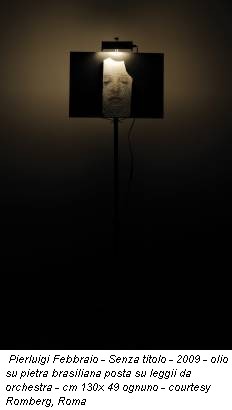 Infine, a ritmare lo spazio che fa da collegamento visivo ed escatologico tra le due sale, dodici leggii da orchestra. Sostengono frammenti di pietra argentina come spartiti di sinfonie liricamente tragiche. Sulla candida asperità del supporto lapideo, tratteggiati a olio, occhi, chiusi a volte in una suggestione alla Bernardí Roig sulla difficoltà del vedere. E ancora: bocche, nasi, porzioni di visi adulti imprigionati nella materia, fissati nella tensione di recuperare la propria interezza.