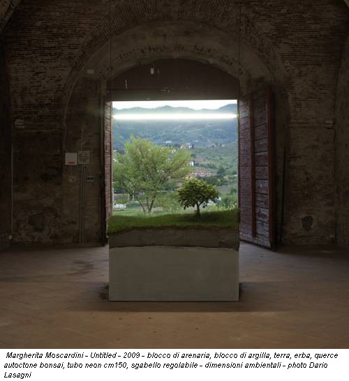 Margherita Moscardini - Untitled - 2009 - blocco di arenaria, blocco di argilla, terra, erba, querce autoctone bonsai, tubo neon cm150, sgabello regolabile - dimensioni ambientali - photo Dario Lasagni