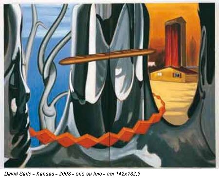 Nell’olio Kansas, forse il più importante tra quelli esposti, il richiamo ai temi dechirichiani è evidente. Sullo sfondo, a destra, un’architettura novecentesca fa da cifra metafisica; gli stessi colori si richiamano a quelle atmosfere cromatiche. Ma anche il filone di pane sospeso, al centro del quadro, echeggia quella pittura, come la catena di quadrati rosso-arancio che ricordano Alberto Savinio. Gli oggetti volanti che circondano una scenografia sono invece tipici di Salle.