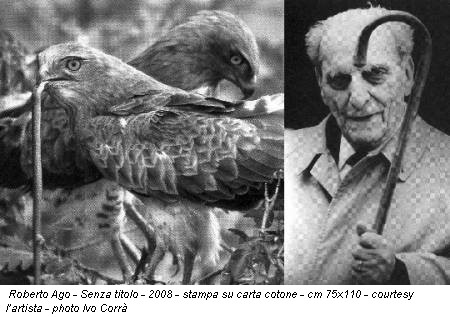 Fa appello alla ragione il Senza titolo a parete di Roberto Ago. Un dittico, due scene simboliche atte a rappresentare il contrasto fra pensiero razionale e furore aggressivo: il pensatore critico Norberto Bobbio da una parte, due aquile dall’altra. La forza che sostiene l’opera è determinata da un ossimoro visivo: due rappresentazioni opposte ed estranee in un equilibrio solo visivo.