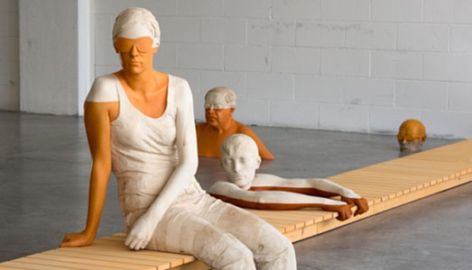 Per Walpoth il discorso della figura è essenziale; l’anatomia, la bellezza, il senso dell’estetica sono fondamentali e il modello è il suo strumento. Ma ogni anatomia è diversa, non c’è riproducibilità. “Quando il modello va via rimane la scultura”, ci dice. Poi l’artista confida: “non faccio mai ritratti, aspetto sempre quel momento in cui la persona che raffiguro si stanca o si distrae ed è mentalmente assente perché quello è il momento più interessante; dallo sguardo distratto si può accedere ad un mondo segreto”. Nelle figure di Walpoth il volto è parte essenziale dell’opera, è lo specchio dello spettatore. Così anche per le opere di Walter Moroder dove il volto, e ancora di più gli occhi, sono il ponte verso l’interno.