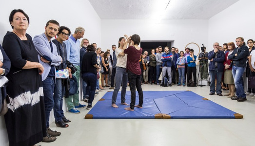 In questi giorni la galleria Ar/Ge Kunst in via Museo a Bolzano sembra una palestra vuota; pulita e ordinata come se non ci fosse entrato nessuno e già pronta per ospitare lunghe sessioni di allenamento. Nella prima parte della sala troviamo una serie di attrezzi disposti con criterio e, in sottofondo, si sente il suono di alcune voci che somigliano al jingle di qualche pubblicità. Gli attrezzi sono in realtà delle sculture e il jingle non è una canzoncina di intrattenimento ma il video di una performance. Le sculture riprendono esattamente la forma dell’attrezzatura ginnica e, il video, mostra la registrazione di una performance del coro di Fiè allo Scillar che si esibisce nel canto tradizionale intento a seguire i movimenti indicati dalla coreografa Claudia Tomasi.