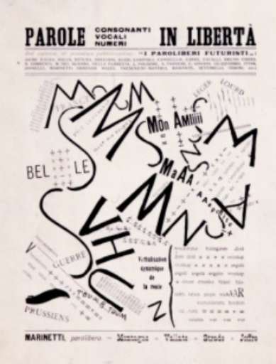 In principio fu il verbo futurista: scardinare lo status quo tipografico e letterario, attraverso un florilegio di lettering e un largo ricorso alle onomatopee, come documentano le parole in libertà di Marinetti e Depero, piuttosto che i dipinti di Soffici, Carrà, Boccioni, Severini, Balla e Baldessari, in cui la parola, scritta o applicata tramite collage, ha un ruolo centrale. Ci sono naturalmente numerosi libri d’artista futuristi, sia italiani -citiamo, oltre all’imbullonato di Depero, almeno le litolatte di Tullio d’Albisola, le cui pagine sono stampate su fogli metallici- che russi, come lo squisito Per la voce di Majakovskij, con superba grafica costruttivista di El Lissitskij.