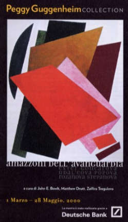Il Futurismo, il Dadaismo e il Cubismo assimilati nei primi anni del ventesimo secolo dall’arte russa, determinò una crescita artistica associata ad una equilibrata difesa dei valori tradizionali e folkloristici, che sino ad allora avevano distinto la stessa. Il movimento artistico di quel periodo contribuì ad un rinnovamento non solo tecnico-semantico, ma bensì intrecciò le fila dei rivoluzionari cambiamenti politici, sociali ed ideologici. Nel panorama russo si affacciavano pittori della levatura consistente come Malevich, El Lissitzky o Rodcenko, e sulle loro scia nasceva la sperimentale iniziativa di Popola, Rozanova, Stepanova, Exter, Goncarova e Udal’cova. La Peggy Guggenheim collection, in collaborazione con la Deutsche Bank ha pensato giustamente di portare alla luce i capolavori di queste “eroine”, omaggiandone l’apprezzabilità tecnica e la spiccata semantica rinnovatrice. Questo progetto nasce con caratteristiche itineranti, ovvero la medesima mostra prevede una tappa in più città mondiali (Deutshe Guggenheim Berlin /10 luglio-17 ottobre 99; Royal Accademy of Arts, London / 13 novembre 1999-6 febbraio 2000; Solomon Guggenheim di New York /14 settembre 2000- 7 gennaio 2001), ciò a conferma dell’importanza che l’evento detiene nel palinsesto che la Fondazione ha organizzato.