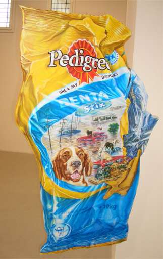 Dalla catastrofe annunciata alla catastrofe divenuta: in Real Time, la nuova personale padovana, un colpo di vento spazza via, con le scatole vuote dei prodotti, anche il dramma quotidiano documentato dai media. Il packaging si contorce, collassa sotto il peso eccessivo di informazione, i prodotti acquistano connotati metamorfici e si riducendono a misera immondizia (o macerie a seconda del livello di senso, per dirla con Augé) che si accumula e stratifica. De Pascale ha perseguito con costanza, invero assai rara, un progetto concettuale complesso, cercando di indagare le chance della pittura, che oggi si presenta inevitabilmente debole, per tempi e tecnica, rispetto ad altri media. La pittura e i suoi generi obsoleti, come quello del paesaggio, trovano riscatto proprio nella loro inadeguatezza, diventando formidabile strumento di mediazione e comunicazione sovversiva. Di qui il superamento della bidimensionalità e della gabbia della tela ma soprattutto l’opportunità di utilizzare la strategia della cover (per dirla con le parole del curatore Marco Senaldi) per innescare derive di senso.