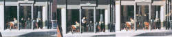 Sono di nuovo accadimenti insignificanti ad essere rappresentati, come il via vai all’ingresso di un bar, di un palazzo di uffici o ad un parcheggio: a mo’ di premessa o illustrazione Gea completa le sue opere con sintetiche e didascaliche descrizione di ciò che sta per accadere… e le letture sono sorprendenti: quello che appariva come un turista spaesato diviene un insospettabile agente segreto in azione; oppure sono gli imbianchini ad essere in realtà una banda di rapinatori in azione, mentre ad un bar viene scoperta una riunione segreta che si risolve in una veloce fuga. Real/Fiction, la realtà si mescola alla finzione rendendo impossibile distinguerle l’una dall’altra; Gea dà la sua interpretazione ironica e provocatrice di un filone della ricerca artistica sul quale si sono messi alla prova numerosi artisti di ultima generazione: Alessandra Tesi per esempio, ma anche Luisa Lambri, Elisabetta Benassi, Lara Favaretto, per citare solo alcuni italiani (tutte ragazze, per altro, perché la giovane arte italiana vanta molte presenze femminili di qualità).