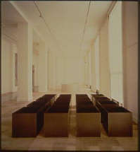 Donald Judd (Excelsior Springs 1928 – NY 1994) utilizza preferibilmente elementi modulari costruiti con materiali industriali. Le forme primarie (cubi, parallelepipedi, ecc.) sono allestite isolatamente o a pile a distanze regolari, a terra o a muro. Superfici colorate o, ancor più spesso, riflettenti, esatte sequenze matematiche: lo spazio viene governato attraverso un ordine che comprende in sé armonie cromatiche, sonore, e spaziali. E’ la sintesi del monolite.