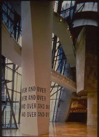 Lawrence Weiner (NY 1942) utilizza la parola come strumento di espressione. Artista concettuale, pienamente partecipa del clima americano degli anni ’60, sulla linea di Kosuth egli elabora testi o brevi dichiarazioni che rimandano ad una dimensione invisibile e le colloca sui muri, quali moderne epigrafi.