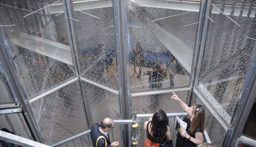 L’assemblaggio di circa un centinaio di barattoli ricoperti di vernice gocciolante, ha un effetto pittorico e straniante e pittorico al tempo stesso , che richiama alla memoria quelli di Daniel Spoerri e di Arman. Superato questo ambiente, si trova una scala che conduce a una terrazza panoramica del padiglione affacciata sui Giardini, dove incuriosisce un complesso e labirintico groviglio di tubi simili alle grondaie che invita il visitatore a introdurre le monete, le quali finiscono dentro a una grande vetrata e nel tempo porteranno a compimento un’ architettura vagamente Jugendstil, effimera, d’impatto scenografico che invita a riflettere su intriseci rapporti fra arte e architettura: perno costrutti