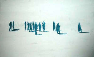 I suoi dipinti colgono di questo immaginario gli aspetti più metafisici. Nell’abbagliante biancheggiare delle tele transitano quasi vibrando sagome scure di gente sconosciuta, animuncole perse, in preda ad un horror vacui che le spinge a tenersi raggruppate nel timore di affogare nella luce. Una pittura minimale quella di Aquilanti, che pure riesce ad essere di forte drammaticità tanto che, a tratti, sembra di sentire riecheggiare i passi delle piazze di De Chirico.