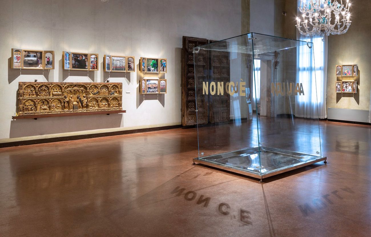 Questo non è un lavoro politico sulla condizione dei profughi in Medio Oriente, ma una toccante documentazione sulle modalità di cogliere l’identità, il diritto all’esistenza dei bambini , che non hanno perduto la voglia di giocare, di vivere, seppure in una condizione non normale in cui diventare adulti. Dynys con questo progetto ideato per il Museo Correr ha superato se stessa, paradossalmente , è un inno alla vita, all’amore per la grazia , poesia e sensibilità estetica del suo sguardo, capace di trasfigurare la realtà in una visione metafisica. Le sue immagini davvero toccanti, d’immediata seduzione estetica, sembrano dipinte con pittura a olio, oltrepassano il presente e si inscrivono nel tempo della storia dell’arte. L’artista, immortalando gesti e sguardi di bambini che chiedono di essere tali, coglie i loro stati d’animo , da voce a parole non ascoltate, chiudendo i loro gesti, posture , azioni e luoghi disumani in una dimensione congelata, rarefatta, di imperitura bellezza, in cui la fotografia diventa lo specchio iconico dinamico di una dimensione irreale. Il tema non è facile, c’è il rischio di scivolare in voyerismi inutili: Dynys ha utilizzato la fotografia come una pratica dello “strappo” di pelle della realtà, per elevare l’istante in un astrazione spazio temporale sublime. Nel reportage gli sguardi, le torsioni plastiche dei bambini che vivono l’anomalia della guerra, della violenza come una normalità quotidiana, nei ghetti, dove non esistono diritti, testimoniano che nonostante la follia degli uomini, essi vivono, giocano e forse sognano di diventare adulti anche nelle condizioni peggiori. L’anomalo reportage di una infanzia lacerata di Chiara Dynys, riscatta tutti i bambini che vivono nelle aree di conflitto dalla loro condizione di vittime innocenti, non solo libanesi, incastonando le immagini in trittici dorati, che dialogano con i polittici medioevali a fondo oro esposti al Museo Correr e nella Sala delle Quattro Porte, tra le più preziose di tutto il museo, con il rilievo cinquecentesco “Madonna col Bambino”, di Jacopo Sansovino. Gabriella Belli, sensibile a tematiche sociali, dopo aver ospitato al Correr le mostre dell’artista americana Jenny Holzer e l’iraniana Shirin Neshat, in linea con le precedenti esposizioni dedicate a tematiche sociali, quest’anno ha invitato l’artista italiana a dare voce con un progetto mirato, con l’obiettivo di mostrare senza descrivere le troppe ingiustizie diffuse in diverse parti del mondo. Al centro della sala, una grande installazione con teca di cristallo, attraversata dalla scritta in oro “Non c’è nulla al di fuori” tratta dal pensiero di Sant’Agostino, diviene un elemento di congiunzione tra dentro e fuori, mettendo in primo piano il diritto dell’infanzia come protagonista dell’intero progetto. Dynys dimostra una raffinata capacità di rielaborare attraverso la fotografia l’iconografia appartenete alla storia dell’arte, in cui linea, colore, composizione formale dell’immagine si iscrivono in valori pittorici e nella ricerca dell’armonia tra le singole parti che costituiscono l’opera, invitando lo spettatore a liberarsi da pregiudizi per cogliere l’essenza del concetto di innocenza , di istinto vitale iscritto negli guardi nitidamente “intagliati ” di bambini di ieri , oggi e domani, incastonati come diamanti in scrigni preziosi simili a sculture che trasudano inquietudini di una limpida e sacrale bellezza.