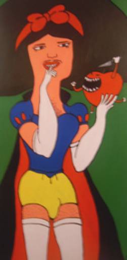 Il concetto di critica all’apparenza è continuato da Ivana Falconi, che allestisce in una teca un piccolo mondo fungoso, un po’ come quello dei puffi o dei folletti. Peccato che i funghi in questione siano velenosi e che quindi l’espressione soddisfatta dello gnomo che ne spunta fuori non possa che essere irreale o, quanto meno, poco duratura. Per restare nel tema delle fiabe, divertente e sagace è l’opera di Teresa Morelli, dove una Biancaneve che in realtà è un trans -anche mal curato- tenta di mordere una mela diabolica, che nel frattempo sfodera un coltello lungo e affilato. Non meno irriverente è la sua famiglia di supereroi americani, in piena regola per tutto tranne che per il fatto di essere afro e brutti, con un Superman con la pancetta e una Wonder Woman dalle gambe corte.