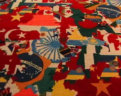 Visione del contemporaneo e attenzione al singolo individuo. Nei lavori realizzati in telai, Human World, Scarponi, con un linguaggio conciso fatto di poche parole, sconvolge la geografia del mondo. Sono quattro planisferi senza legenda: solo lo squilibrio tra i Paesi del mondo, solo il sentore di una terra frammentaria, la sottile coscienza di una geopolitica degenerata. La bandiera è l’elemento portante, presente anche nella serie dei tappeti di chiara ispirazione boettiana: Polis e Camouflage. L’identità di ogni Paese emerge attraverso il potente escamotage iconografico della bandiera. Nei tappeti si scopre una vera e propria sovrapposizione, confusa e regolare, dei simboli di tutti i vessilli del mondo. L’artista crea l’intelaiatura, una trama di cui noi siamo singoli nodi, tenuti legati da fili chilometrici. Ogni singolo pixel e ogni singolo nodo del lavoro di Scarponi sono la “popolazione”. In un inquietante gioco di proporzioni e d’ironia concettuale.