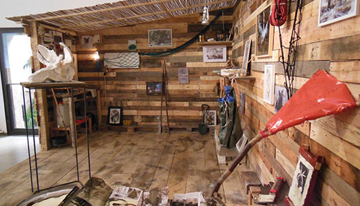 A ragione quindi Meneghelli parla di “work in regress” per Costa e “work in progress” per Girardi: se il primo ha mai ormai concluso il proprio viaggio alla ricerca della sorgente, il secondo ha da poco intrapreso il proprio nelle terre incontaminate dei paesi nordici. Il suo lavoro è fatto di pura esperienza, non trova concretizzazione materiale, né lascia testimonianza fisica e tangibile del suo agire. La ricerca di Girardi si basa su un viaggio interminabile, in solitaria, nella natura. Un andare senza meta che si nutre solo di esperienza. Se volessimo proporre un paragone il riferimento sarebbe sicuramente Richard Long e le sue “passeggiate” in contesti paesaggistici e naturali incontaminati al fine di accreditare la relazione tra l’uomo e l’ambiente come “fatto” creativo per eccellenza, intimo e primitivo, privo di ingombranti implicazioni volontaristiche e di ridondanti mediazioni artificiali. A differenza di Long però Girardi non lascia traccia di sé e del suo passaggio. Se quella del landartista è un’esperienza potenzialmente replicabile (grazie alle mappe che documentano il percorso e alle tracce passeggere disseminate lungo il tragitto), quello del giovane veronese è un procedere che non lascia segno alcuno, che non ritornerà più, se non nella memoria dell’artista stesso. A La Giarina Girardi ricostruisce un ideale rifugio, come farebbe nei boschi della Norvegia, e vi colloca zaini, bussole, appunti, mappe, sacchi a pelo, corde, fotografie, disegni, tutto ciò che in un bivacco, in un rifugio in cui un uomo vive solo e a contatto con la natura, può accumulare per finalità pratiche (come mangiare, scaldarsi, orientarsi), o per la semplice volontà di ricordare, grazie a una fotografia, a uno schizzo, a un oggetto raccolto, un particolare momento dell’esperienza del viaggio. Nel video MYR Girardi riprende il suo incedere su una superficie incerta: passi lenti e misurati che esplorano il terreno con cautela temendo di sprofondare da un momento all’altro. “Così, ogni incedere è insieme scoperta e minaccia, conquista e smarrimento” scrive Meneghelli. Ma nulla di più ci narra il video, lungi dall’essere documento che accredita e testimonia: vediamo solo due piedi silenziosi, terra, erba e acqua, nulla di più, nessun paesaggio, nessun orizzonte, nessuna meta, nessun accadimento. Al termine del vernissage della mostra Girardi ha prelevato alcuni elementi dall’installazione ed è ripartito per un nuovo viaggio di cui ci recherà testimonianza tra un mese, al suo ritorno in galleria, per arricchire il suo Bivacco di una nuova esperienza.