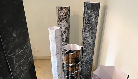 “To Wolf” cattura subito lo sguardo dello spettatore all’ingresso della galleria con l’installazione Bigger is Better (2017) e, nel contempo, lo fuorvia. Un “bosco” misterioso, a tratti forse addirittura oscuro, di solidi geometrici abita infatti le prime due sale, all’apparenza fabbricati di un marmo ponderoso che conferisce loro una parvenza monumentale, monolitica. L’anima delle colonne cela, tuttavia, la vera natura di queste sculture, realizzate in carta fotografica stampata in digitale e avvolta fino a prendere la forma voluta. La trappola percettiva viene, comunque, svelata per volontà dell’artista stesso che lascia intravedere esternamente i magneti di chiusura dei grandi fogli.