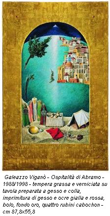 L’apoteosi degli spazi architettonici si stabilizza nel corso degli anni ’90, quando gli edifici sostituiscono i ritratti di un tempo. Allora ecco che tutto ciò che lo colpisce, tra Venezia, Chioggia e le isole della Dalmazia, entra come protagonista nella sua pittura. E qui il tempo, la luce e il colore, assimilati in questi anni nelle sue peregrinazioni marine, rendono tutta la sua pittura abbagliante, come lo erano le icone piene d’oro, a ricercare quella luce taborica, arrivata da Dio, per illuminare il Cristo trasfigurato. Viganò però usa solo questa tecnica, ma il suo cammino è diverso, non arriva al divino né il divino arriva a lui; Viganò arriva all’apice della coscienza tragica della vita e di quello che ogni giorno andrà irrimediabilmente perduto. Come in Evento 2 (2007).