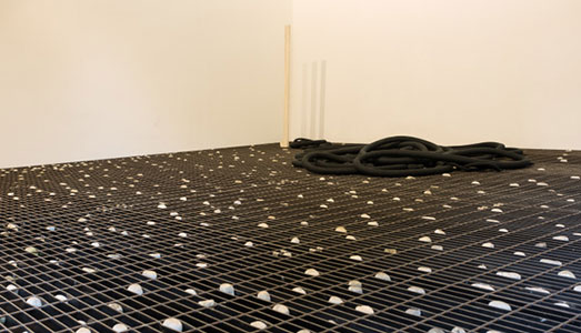 Una griglia metallica rigida sollevata dal pavimento e leggermente inclinata accoglie lo spettatore. I rumori dei passi sulla grata di acciaio svelano tanto inquietudine quanto una più paziente esplorazione dell’opera in un’atmosfera d’incertezza. In essa, si incastrano sparse e senza ordine preciso piccole pietre di misure variabili. La sensazione d’instabilità indotta da questa struttura evoca, nella sua materialità, sistemi di ventilazione industriale o urbani. Chão de caça (2017) si intitola il progetto site-specific che Cinthia Marcelle (Belo Horizonte, 1974) ha creato per il Padiglione del Brasile nei Giardini della Biennale e che ha ricevuto una menzione speciale come partecipazione nazionale.