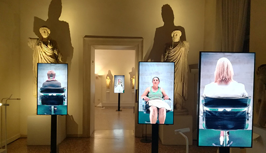 In Piazza San Marco a Venezia, fino al termine della Biennale, potrete scoprire anche una mostra con poche opere, che arrivano al cuore. È la mostra di Francesca Montinaro al Museo Archeologico, che si intitola “Communitas immunitas”. Curata da Raffaele Gavarro, la mostra affronta il tema delle comunità ma ancora di più delle comunità femminili. Ad uno sguardo superficiale potremmo dire di essere invasi da linguaggi “rosa”, da attenzioni verso il cosiddetto gentil sesso, ed invece pare che ce ne sia sempre maggior bisogno. Hic et nunc. Ecco che allora il lavoro della Montinaro, e tra le opere più di tutte quella che fa da “centro” della mostra, acquisisce corpo e sostanza grazie ad una partecipazione attiva dello spettatore che, da sempre, perlomeno nel mondo contemporaneo, è il collegamento forte ed indissolubile di un interno verso l’esterno. L’opera si intitola 11.146.312 metri, che altro non sono se non la distanza percorsa dalla somala Nasra per arrivare in Italia dalla sua patria, è composta di un tapis roulant su cui il pubblico può salire e accrescere la distanza iniziale con i propri passi, allungando sempre più lo spazio ideale tra il punto di partenza ed il punto di arrivo. Nella stessa sala, un display indica lo spazio percorso dal fruitore salito sull’attrezzo ginnico. Ognuno di noi dunque partecipa ed esperisce, idealmente è ovvio, di un passaggio, di un momento delicato, l’abbandono del proprio Paese, il dispiacere, la paura, l’ignoto, per avvicinarsi con un approccio misto di paura, ansia angoscia, verso nuovi lidi apparentemente più sicuri. Non è tragicamente attuale?
