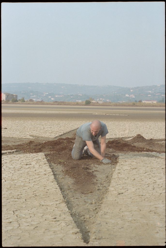 Proprio in virtù di questa intuizione e del legame tra la comunità italo-slovena e quelle saline, io e il curatore Miccichè andammo a prendere diversi quintali di terra direttamente dal confine italo-sloveno, a pochi passi dalla costa. Un terriccio scuro e torbido, pieno di significati simbolici e carico di storia: quel luogo non solo rappresentava la linea politica e amministrativa che divideva le due comunità che avevano abitato e lavorato in quel luogo, ma rappresentava anche concretamente un materiale che conteneva quelle specifiche informazioni che stavo cercando. Ora, la scultura appariva come un enorme disegno composto da due diversi suoli con diverse informazioni, come un monumento che funziona al contrario. Il suo scopo non era quello di resistere nel tempo, imprigionando un’informazione per sempre, ma di dissolversi, ricomporsi e riformulare tutte le informazioni che conteneva. Il risultato finale di questa ricomposizione non è prevedibile, così come non lo è il futuro e l’identità delle generazioni a venire.