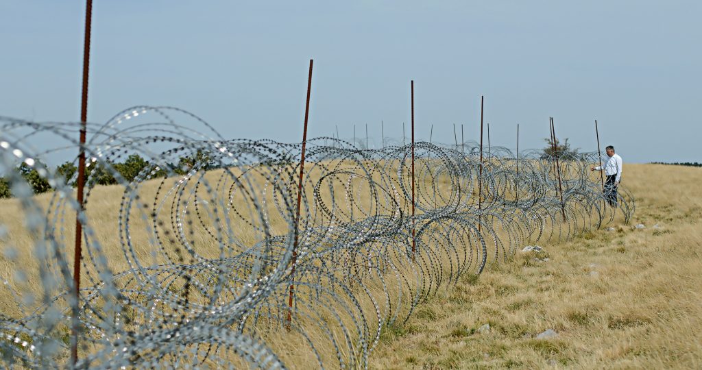 Dalle fotografie di quei luoghi austeri percepivo la violenza silenziosa delle spine d’acciaio, che ammassate ricoprivano l’intera superficie dei muri. Mentre osservavo quel numero infinito di punte taglienti tra loro aggrovigliate, si alimentava in me una suggestione inconsueta, che mi portava a immaginarle come fossero degli epicentri in tensione con i quali interagire. A quel punto, come un bambino cede con irriverenza al desiderio di toccare ciò che gli è vietato, similmente mi sono recato di fronte a quei muri di spine, azzerando ogni eventuale mia distanza interpretativa, ma soprattutto, libero da qualsiasi filtro mediatico. Era nell’ottobre del 2015 quando feci quel primo viaggio, accompagnato da Davide Gatti, regista con il quale collaboro dal 2009, ed Enea Discepoli, fotoreporter che era da poco rientrato dalla Siria, devastata da una guerra intestina.