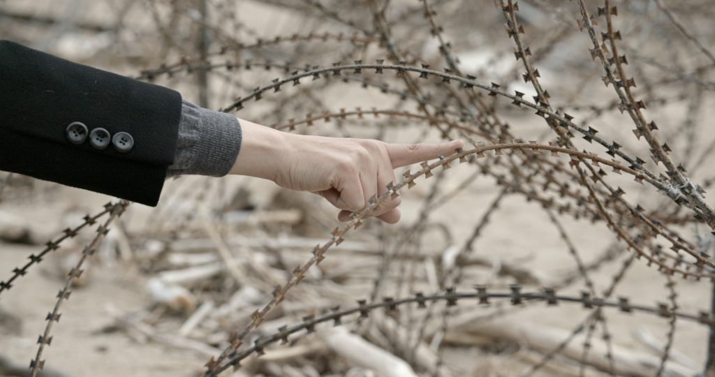 Mentre procedevo con il montaggio del video, mi convincevo sempre più che One by One fosse una performance corale da realizzare, a qualsiasi costo, lungo i confini di Stato, sebbene fossero delle aree militarizzate difficili da raggiungere. Ero inamovibile su questa mia scelta, poiché durante il primo viaggio nei Balcani, ho percepito quei confini, definiti da muri di spine invalicabili, come fossero delle ferite aperte, dove immergersi e respirare una condizione di sospensione. Solo all’interno di quelle strisce di terra, caratterizzate da una costante instabilità identitaria, potevo coinvolgere i locali per offrire a loro un’esperienza introspettiva, basata semplicemente sull’atto di toccare con l’indice ogni singola spina, in modo da percepire a livello epidermico la violenza insita in essa. Il semplice gesto veniva ripetuto sistematicamente, nel fallimentare tentativo di interagire con tutte le spine, contandole una ad una, ad alta voce e nella propria lingua.