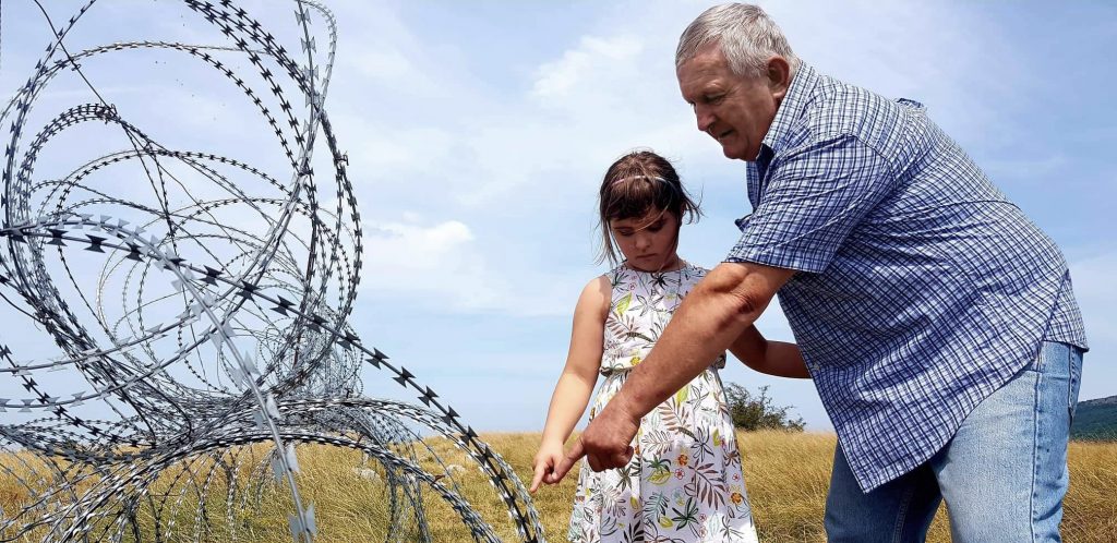 A riguardo, nel luglio del 2019 mi trovavo a Subotica, in Serbia, con l’obiettivo di riuscire a realizzare la performance sul difficile confine con l’Ungheria, dove le spine erano sotto carica elettrica. In quei giorni, Francesca Ceccherini, la producer di One by One, si trovava a Bergamo e lavorava estenuante in stretto contatto con le istituzioni ungheresi, in modo da ottenere il permesso per fare riprese video lungo il loro confine militarizzato. Il silenzio dall’Italia era demotivante. Poi, la mattina dell’ultimo mio giorno di soggiorno in Serbia, mi arriva in hotel la chiamata della responsabile ungherese dell’ufficio stampa della polizia di frontiera. Con un tono severo, mi comunicò di essersi occupata personalmente per garantirmi una scorta militare, in modo da realizzare le riprese video, senza essere arrestati. Questo piccolo miracolo accadde grazie alla sensibilità di un colonnello ungherese, che vuole tuttora mantenere il suo anonimato, il quale ammise di condividere i propositi del progetto. Sul confine croato, nel piccolo villaggio di Novačka, Elizabeta M. G. decise di coinvolgere il figlio di sei anni, e sebbene conoscesse la violenza della polizia croata, ammise la sua curiosità nel vedere con quale accusa avrebbero arrestato suo figlio. In Slovenia, Giuliana B. non riusciva a fermare le lacrime nel contare quelle spine, in quanto riemergevano in lei ricordi del passato, motivo per cui abbiamo più volte interrotto le riprese. Ma che dire di Branco, un pastore croato che coinvolse anche la nipote di cinque anni, il quale più volte trovò i suoi animali morti sul confine di Stato, intrappolati nel groviglio di spine. Finite le riprese, mi invitò a casa sua, dove, con il gruppo di lavoro, passai ore piacevoli, ascoltando vecchie storie tipiche dei luoghi di confine, alternate ai canti tradizionali che intonava con sua madre. Mirjam B. mi ospitò a casa sua, situata sul confine tra la Slovenia e la Croazia, facendomi vedere la barriera spinata, che da un giorno all’altro si trovò costruita sul perimetro del suo giardino. Fu lì che ovviamente realizzammo con lei e suo padre la performance. In quei viaggi la presenza umana si manifestava anche implicitamente in altre forme, come nei brandelli di vestiti impigliati nel groviglio di spine del muro tra la Macedonia del Nord e la Grecia, vicino a Gevgelija, e appartenuti a persone vittime della violenza di una frontiera che non si lascia oltrepassare. Sempre lungo lo stesso confine, ma a Idomeni, dove corrono le rotaie di una ferrovia, mentre stavamo facendo le riprese, passò lentamente un treno merci e delle persone stavano pericolosamente aggrappate ai vagoni. Il poliziotto che ci scortava, osservandomi sconsolato, mi disse che doveva assentarsi per eseguire il suo amaro dovere, ovvero fermare il treno per espellere quegli individui. In quel momento il confine della divisa crollò, facendo emergere la profondità emotiva dell’essere umano.