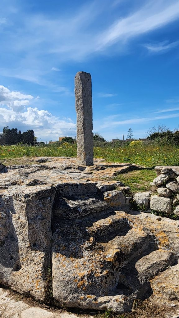 L’installazione che ha preso forma, Uncovered Layers (2025), è una struttura verticale composta da blocchi di pietra scolpiti, realizzata insieme a Marco. Ogni blocco custodisce frammenti della Sud Salento: i dolmen e i menhir, la Cripta della Madonna della Scala, l’antica porta di Porto Badisco dove gli Illiri approdarono con le loro navi, la poesia di Rina Durante e la vista delle montagne albanesi all’orizzonte da Otranto. Ho anche inciso un proverbio albanese: “Mali me malin nuk takohen” (Le montagne non si incontrano), ma l’ho riscritto sotto forma di domanda: Chi ha detto che le montagne non possono incontrarsi? Questa domanda risuona profondamente con il mio percorso di artista e di rom albanese, sfidando i confini che la storia cerca di imporre. In cima alla colonna, ho scolpito il verso iniziale dell’inno rom “Gelem Gelem: Gelem Gelem Lungone Dromensa Maladilem Bahtale Romensa” (Siamo andati, siamo andati su lunghe strade, e abbiamo incontrato Rom felici) È un verso che unisce tutti i viaggi, le influenze culturali, le migrazioni e gli incontri che definiscono questa terra.