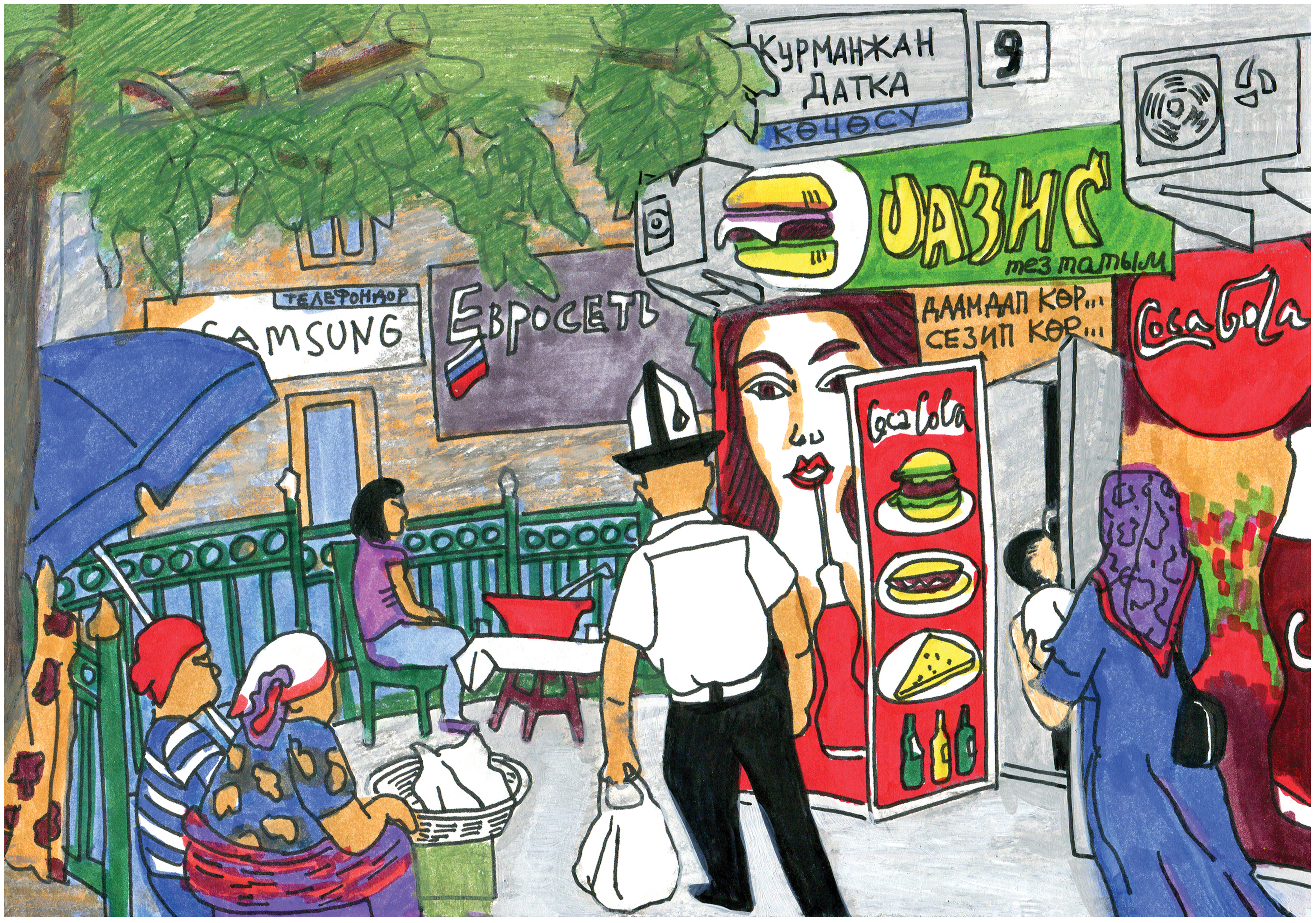 Quando ero da sola, vagavo per la città, disegnando persone e paesaggi. Si può capire molto di un paese straniero semplicemente osservando con attenzione lo scorrere della vita quotidiana. Ad esempio, donne in hijab sedute sotto tendoni Coca-Cola, uomini con copricapi nazionali kalpak e ragazze in minigonna che camminano per le strade; le scritte sui cartelloni pubblicitari iniziano in kirghiso, continuano in russo e finiscono in inglese… Questa è l’Asia centrale, un luogo di commistione tra molte culture e influenze politiche. E questa è la Georgia, unpaese dove l’influenza della Chiesa ortodossa è incredibilmente presente. In tutte le città ho trovato reliquie dell’impero sovietico – un monumento comunista con il naso deteriorato, una stella a cinque punte decaduta o frammenti di mosaici pomposi.